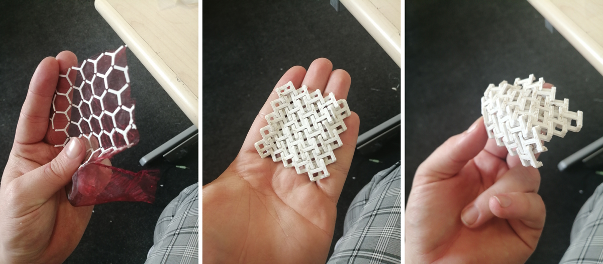 Chris has really engaged with using the Craftbot 3D printer and takes the opportunity to try new things whenever possible. This includes these 3D fabric pieces below. "The fabric was a thing I was experimenting with to find a way to merge the fluidity of fabric with the rigidness of plastic. These are some samples I made to demonstrate how it would work."